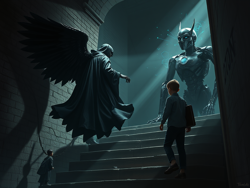 Metatrón, el tecno-sacerdote, bajó los peldaños desvencijados del sótano, su capa negra agitándose a su alrededor como las alas de un cuervo. Había recibido una llamada urgente de la familia Blackwood, cuyo hijo de 10 años había encontrado algo perturbador en lo más profundo de las sombras de su casa. «Es un demonio de metal, … Continuar leyendo Exorcizando Demonios Tecnológicos: La Historia de Metatrón