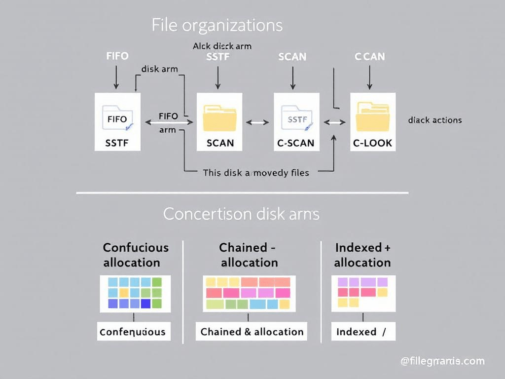 - Asignación encadenada: Directorios con números de archivo y la dirección del bloque inicial.